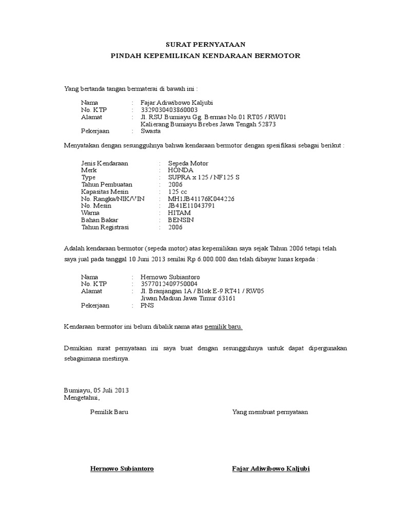 Surat keterangan kami yang bertanda tangan dibawah ini : Pengertian surat kuasa pengambilan bpkb. Namun, kadang si pemilik bisa saja tidak bisa mengambil langsung hal itu, karena berbagai uzur atau halangan, atau. Stnk berisi identitas pemilik, nomor rangka, nomor mesin, nomor polisi, nomor registrasi kepemilikan, dan daftar rincian jumlah pajak. Dengan membaca artikel ini kamu akan bisa membuat surat kuasamu namun sebelum itu, akan saya ulas sedikit tentang apa itu surat kuasa, fungsi surat kuasa dan apa saja macam surat kuasa. Surat keterangan kepemilikan kendaraan by dewisyarvian in types > legal forms and surat keterangan kepemilikan. Wa ode nurbay nomor ktp : Surat kuasa merupakan surat yang tujuan dibuatnya adalah untuk memberikan suatu kuasa atau wewenang kepada pihak tertentu guna melaksanakan suatu tugas atas nama si pemberi kuasa. Bpkb atau bukti kepemilikan kendaraan bermotor merupakan salah satu dokumen penting yang harus dimiliki oleh semua pemilik kendaraan bermotor. Biasanya sebelum membuat surat kuasa, para ahli waris akan berkumpul dan menentukan siapa saja yang. Surat kuasa pengambilan bpkb kendaraan bermotor sebenarnya mudah dibuat, asalkan kamu mengetahui prosedur dan isi dari surat kuasa hal ini sebagai menjadi bagian dari legalitas sebuah kendaraan di indonesia. Surat pernyataan yang bertanda tangan dibawah ini saya : Pelanduk menyatakan dengan sesungguhnya bahwa 1 (satu) unit kendaraan berupa sepeda motor / mobil dengan spesifikasi.