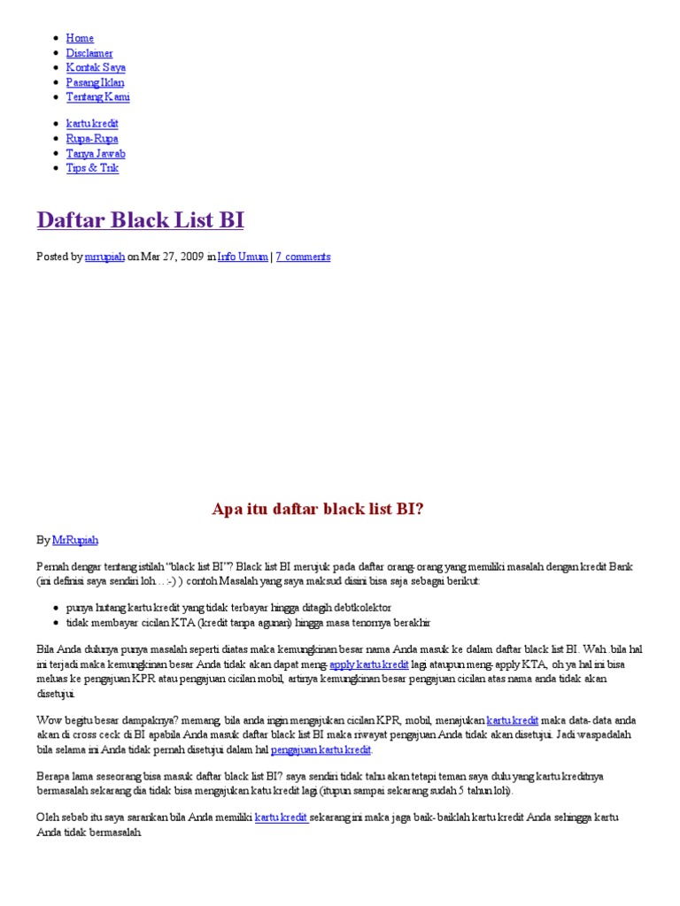 Apabila nama kamu tercantum dalam blacklist karena memiliki riwayat kredit yang tidak baik, maka inilah cara membersihkan nama dari blacklist bi checking. Penipuan tarik dana saya tidak di kirim. Gimana cara keluar dari daftar hitam blacklist ini? Kena blacklist bi bikin kredit ditolak melulu, ini cara keluar dari daftar hitam. Barang sudah diterima namun belum melakukan transfer pembayaran selambatnya 3 hari.